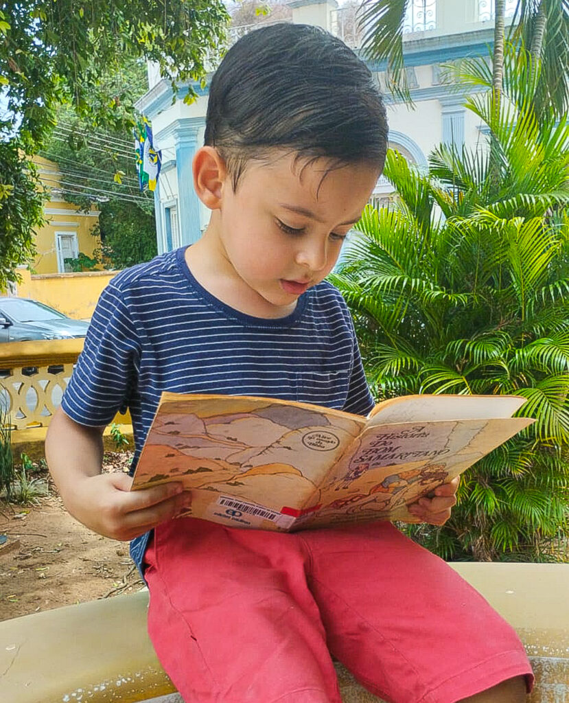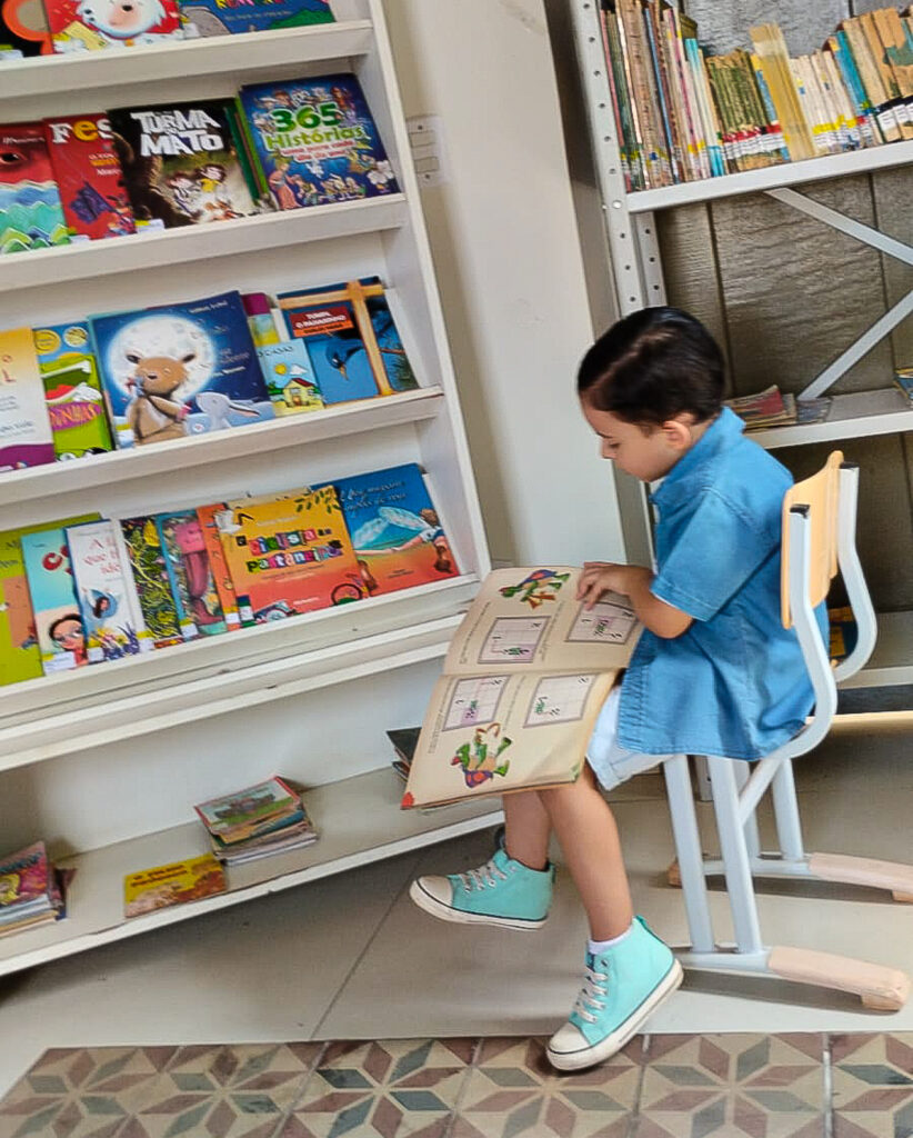 Frequentador assíduo da biblioteca, Benjamim é um apaixonado por histórias desde os primeiros meses de vida. Sua mãe, Suelena Santos Carvalho, conta que sempre incentivou o hábito da leitura. “Quando estava grávida dele, fiz um curso sobre a importância da leitura em voz alta. Desde bebê, todos os dias leio para ele, e isso fez uma grande diferença no seu imaginário. Ele ainda não sabe ler, mas já memoriza poesias e histórias inteiras de tanto ouvi-las”, relata.